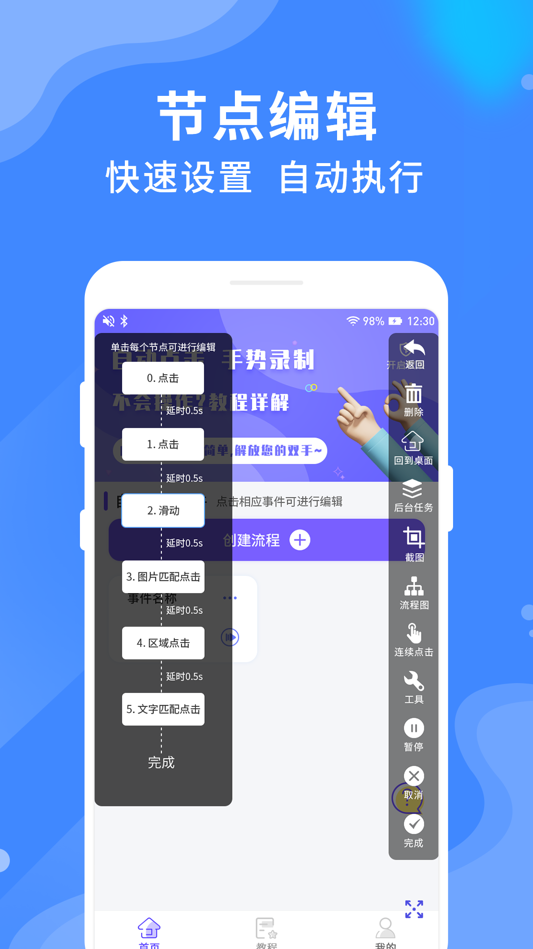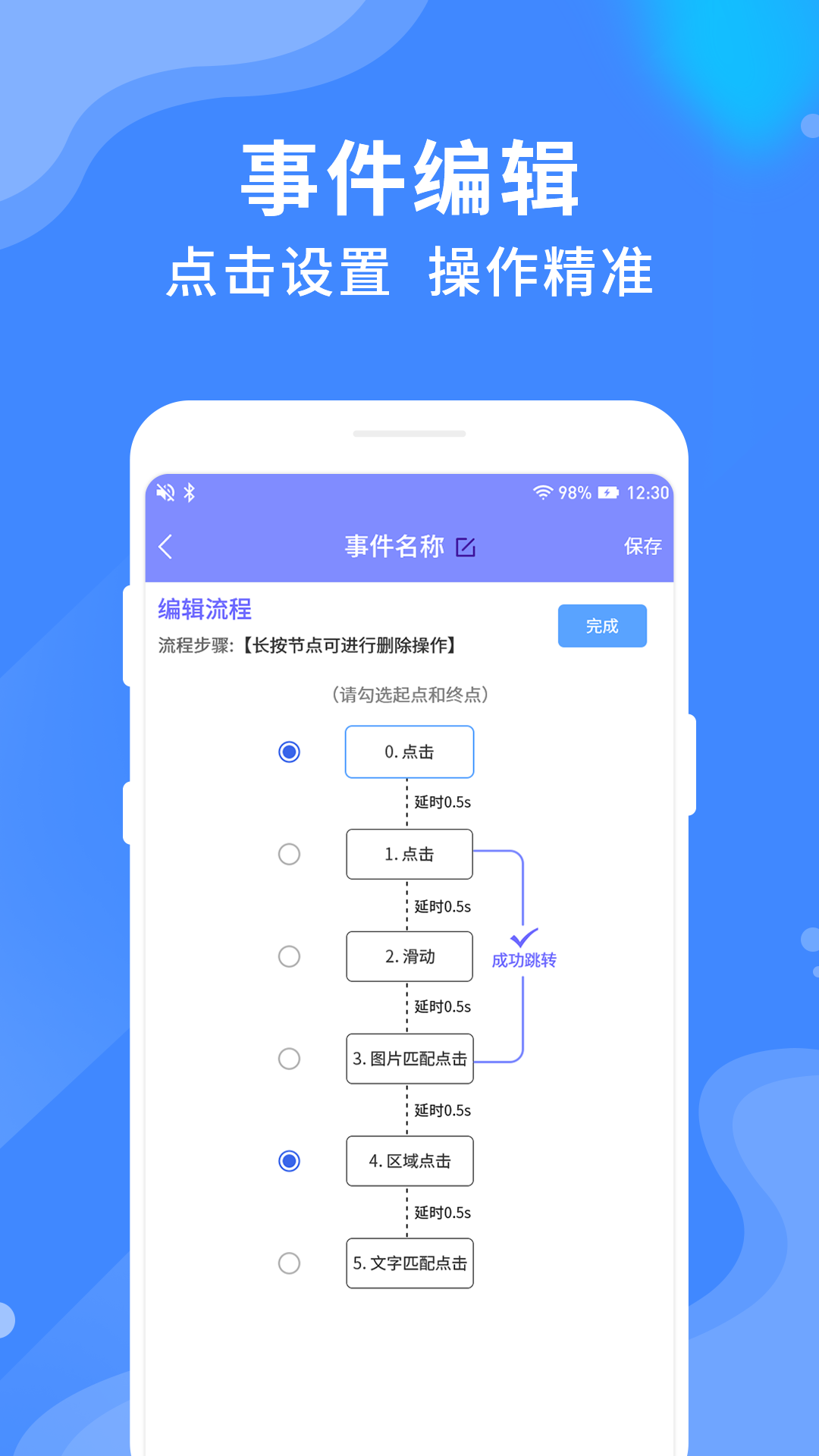 对录制好的脚本,大图标一键启动,还可以设置定时 定点启动,针对操作手机不灵便的人群,极大的方便了操作不便的人。实在操作困难,也也能在家人、朋友的帮助下方便完成操作。
